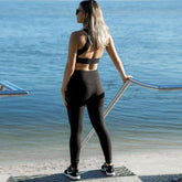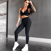 The High stretch straped V-Neck push up fitness top and these high rise legging set are perfect! The leggings rise covers the hip area and lands just below the belly button giving you a chic and sexy look. The colorful design is eye-catching and trendy. The strap creates an amazing feminine look.
