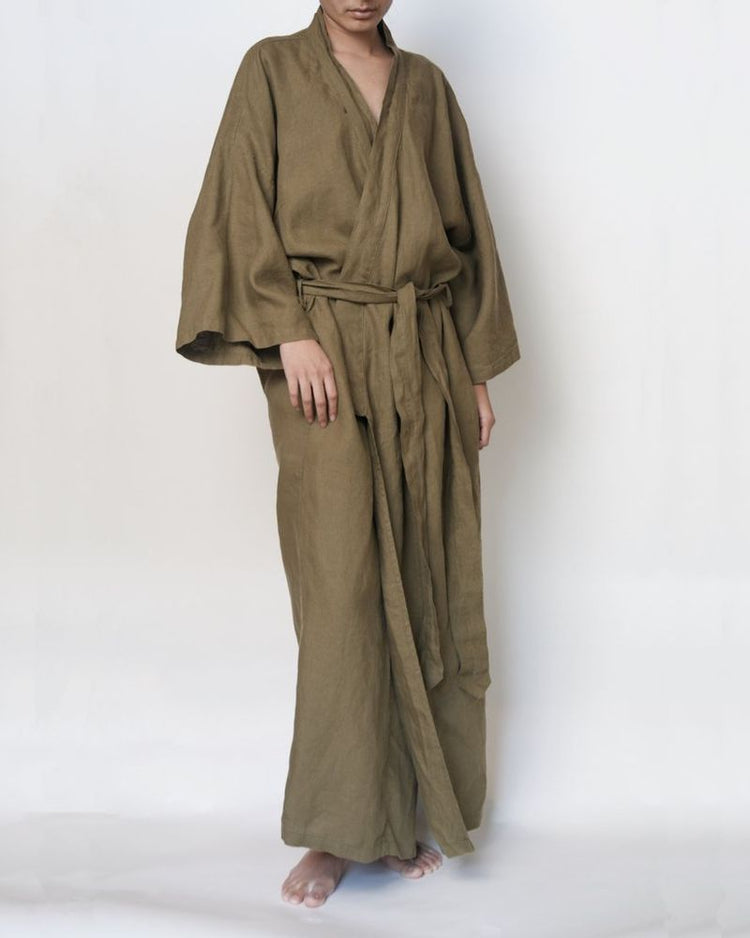 Sai Full-Length Linen Robe SHOP NOW Our Linen Robe, comprised of French linen, is a Japanese-inspired, full-length Kimono-style statement piece. The robe has hidden, low-hanging pockets on the side seams and is one size fits most (0-16).