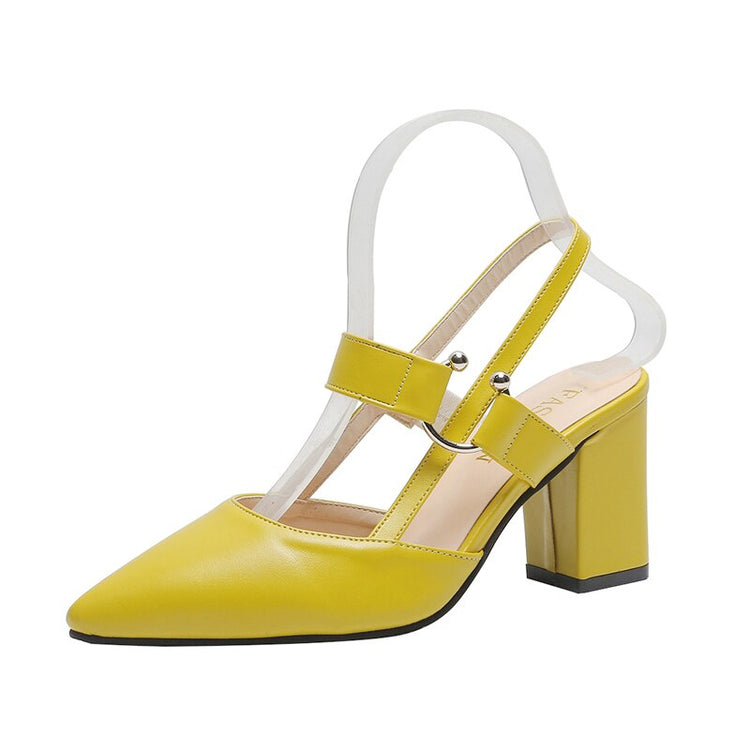 Step up your shoe game with these chic and comfortable Slingback High Heels! Crafted with a sleek and stylish design, these sandals are the perfect addition to any fashion-forward woman's shoe collection. The pointed toe and square heel add a touch of sophistication, while the metal decoration adds a trendy and modern element.